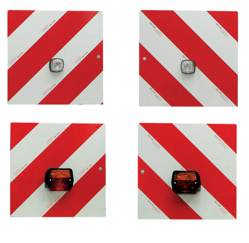 komplett verkabelt mit Beleuchtung, 2 Warntafeln DIN 11030, einseitig retroreflektierend mit Dreifunktionskabelleuchte nach hinten, 2 Warntafeln DIN 11030, einseitig retroreflektierend mit Positionsleuchten nach vorne, komplett montiert mit Halterung für Winkeleisen nach DIN 11027