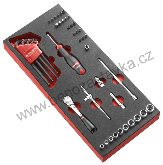 Produkt obsahuje: • Hlavice: R. 5,5 - 6 - 7 - 8 - 9 - 10 - 11 - 12 - 13 - 14 mm• RL.161 ráčna • R.120A vratidlo • J4763 prodlužovací nástavec s vroubkováním 259 mm • R.209 -R.215 prodlužovací nástavce 55 - 150 mm • R.236A nástavec s rukojetí • 83SH.JP9A: Sada zástrčných 6hranných klíčů 1,5 - 2 - 2,5 - 3 - 4 - 5 - 6 - 8 - 10 mm • R.240A univezální kardan • R.235 adaptér na bity 1/4" • ECR adaptér na hlavice Bity: 6-hranné: 3 - 4 - 5 - 6 - 7 mm Resistorx®T:15 - 20 - 25 - 27 - 30 - 40 Torzní ploché 4,5 - 6,5 - 8 mm PZ 1 - 2 - 3 PH 1 - 2 - 3 •Prázdný modul: PM.MODR1A |